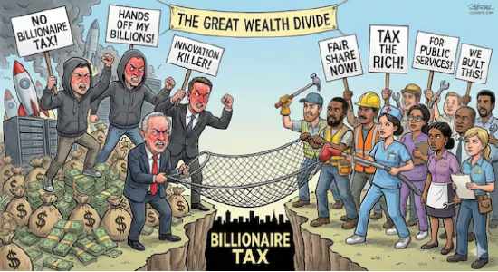 特别是在加州面临医疗、教育等公共服务资金短缺的时刻,拥有2.2万亿美元财富的亿万富翁群体似乎是理想的收入来源。提案支持者质问:为什么让中产阶级承担削减公共服务的痛苦,而不是让那些财富几辈子都花不完的人贡献一小部分?