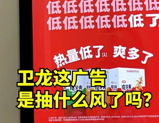近日,卫龙美味的一段15秒广告被打工人疯狂吐槽,原因是广告中出现了22个“低”,被直指“太洗脑”。值得注意的是,广告中的主角不是卫龙美味的龙头产品辣条,而是近年来越来越受重视的魔芋爽。